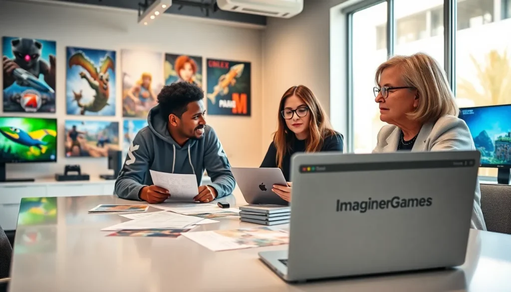 A diverse team at ImagineerGames collaborating in a modern office setting.